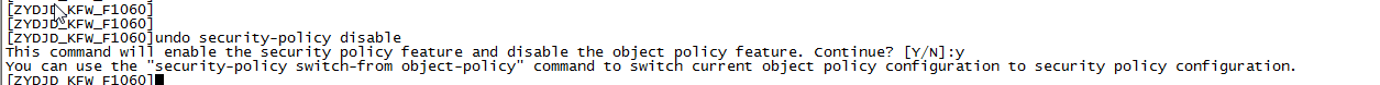 [ZYDJD_KFW_F1060]undo security-policy disable This command will enable the security policy feature and disable the object policy feature. Continue? [Y/N]:y You can use the "security-policy switch-from object-policy" command to switch current object policy configuration to security policy configuration. [ZYDJD_KFW_F1060]