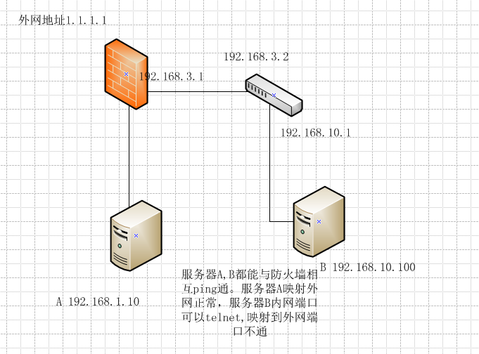 server B 映射的什么端口?域间策略 untrust到trust 放通改端口了吗 ?如果放通了,如果放通了作如下测试,找台pc,连接wan口,地址设成防火墙的网关,网关设置成 1.1.1.1,从这台终端上连接 SERVER B的该端口看看能不能通,如果能通,说明运营商屏蔽了该端口,找运营商联系协商解决,如果不通,防火墙配置问题,主要查看域间策略