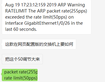 接口下使能了arp限速,即对于接口每秒仅允许50个arp报文通过,超过的丢弃,现场可通过下述命令调整,解决请采纳