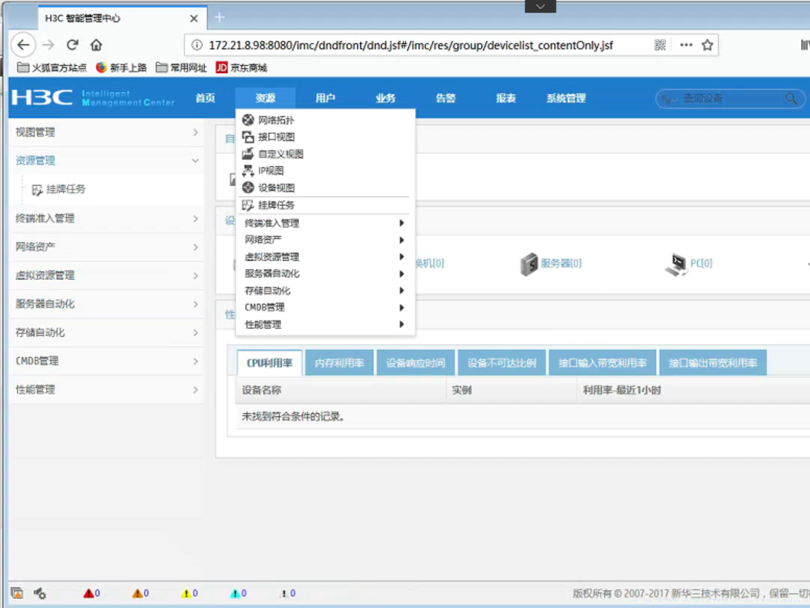 H3C_iMC_PLAT_7.3_E0506_Standard-Windows   这个版本我在其他点装过,都没问题,就是昨天让客户按文档步骤装了后,发现没有添加设备这个菜单,换了浏览器也不行。请问哪们哥遇过IM这种情况?