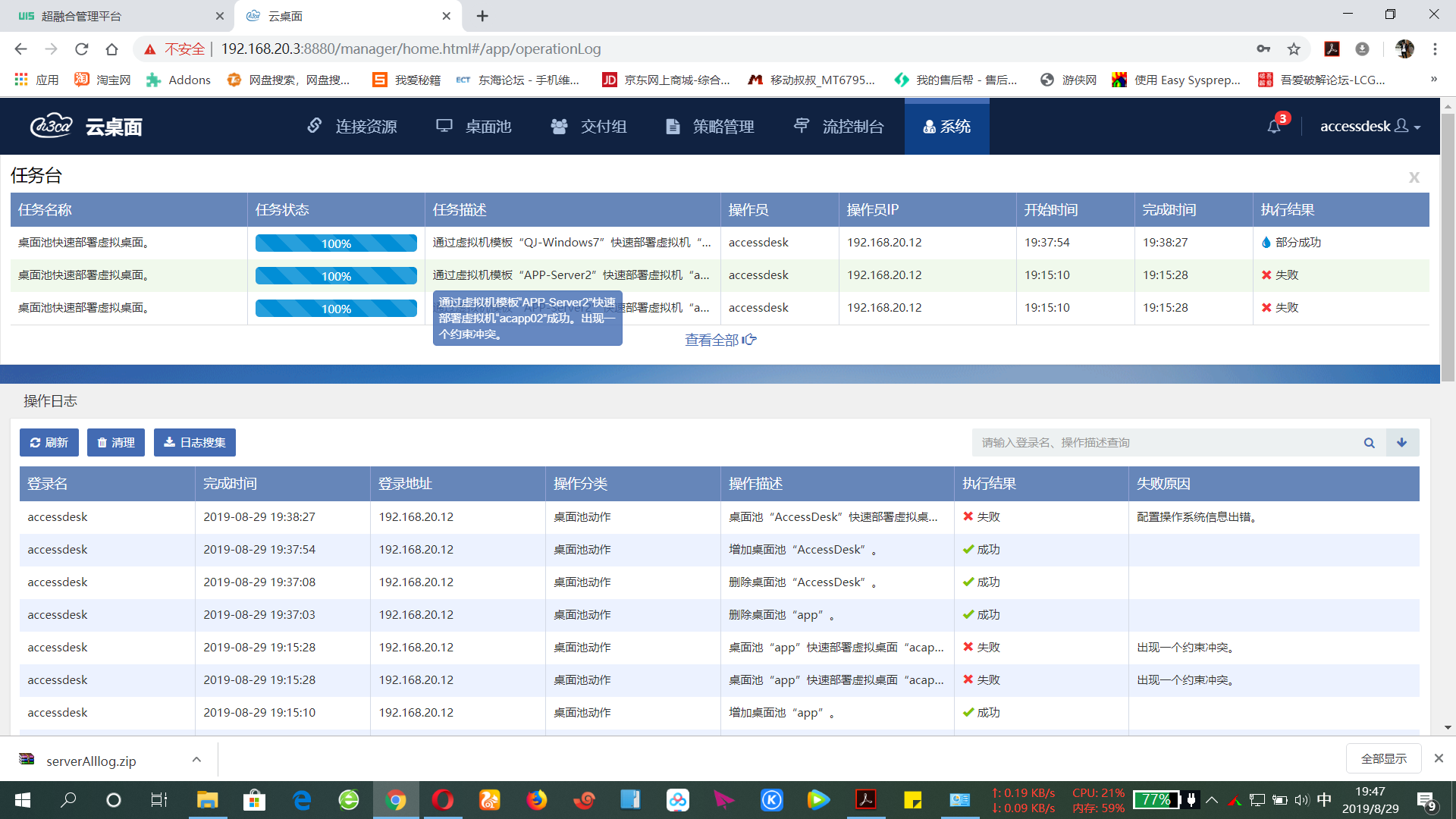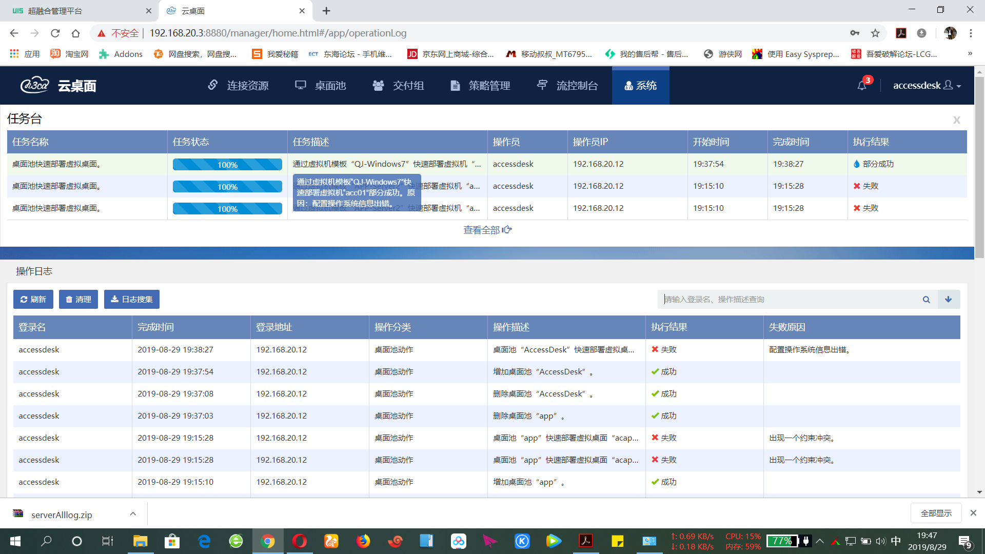 用的UIS部署的,添加资源后部署下发失败,有时候是部分成功,显示部分成功的时候UIS界面可以看见虚拟机创建成功,但是交付组无法创建,桌面池主机数也为零