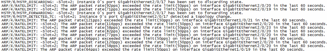 arp报文超限速了,排查攻击源。可在接入交换机侧配置arp限速,防止攻击影响网关。