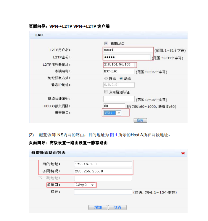 如果web界面没有,可以采用命令行进行一下LAC侧的配置 在NAS上配置: # 配置各接口的IP地址(略)。 # 设置用户名、密码及服务类型。 <LAC> system-view [LAC] local-user vpdnuser [LAC-luser-vpdnuser] password simple Hello [LAC-luser-vpdnuser] service-type ppp [LAC-luser-vpdnuser] quit # 在Async1/0接口上配置IP地址。 [LAC] interface async 1/0 [LAC-Async1/0] ip address 1.1.1.1 255.255.255.0 [LAC-Async1/0] ppp authentication-mode chap [LAC-Async1/0] quit # 启用L2TP服务。 [LAC] l2tp enable # 设置一个L2TP组,并配置相关属性。 [LAC] l2tp-group 1 [LAC-l2tp1] tunnel name LAC [LAC-l2tp1] start l2tp ip 1.1.2.2 fullusername vpdnuser # 启用通道验证并设置通道验证密钥。 [LAC-l2tp1] tunnel authentication [LAC-l2tp1] tunnel password simple aabbcc