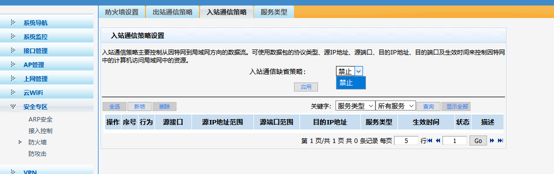 大家好,我现在要在防火墙封特定的端口号,但是在入站缺省这里没办法改缺省允许,说是要把NAT关掉,但是我把NAT关了之后所有pc无法上网,求大神指教