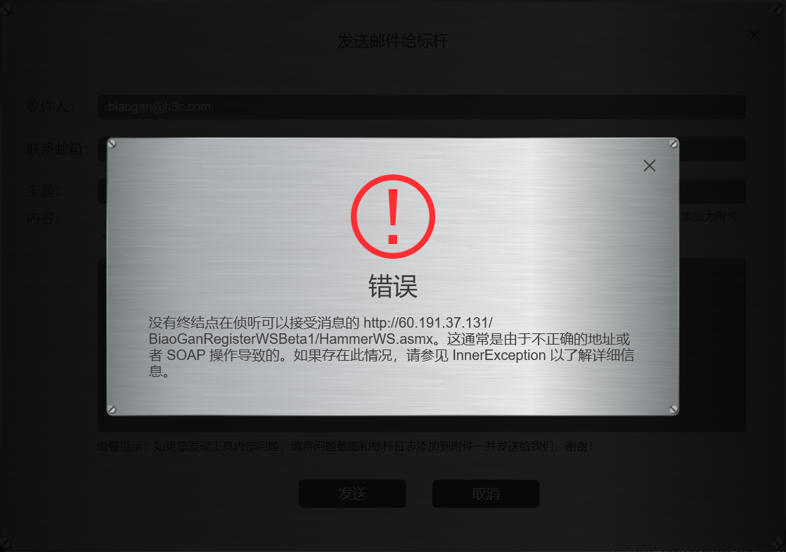 没有终结点在侦听可以接受消息的 http://60.191.37.131/BiaoGanRegisterWSBeta1/HammerWS.asmx。这通常是由于不正确的地址或者 SOAP 操作导致的。如果存在此情况,请参见 InnerException 以了解详细信息。