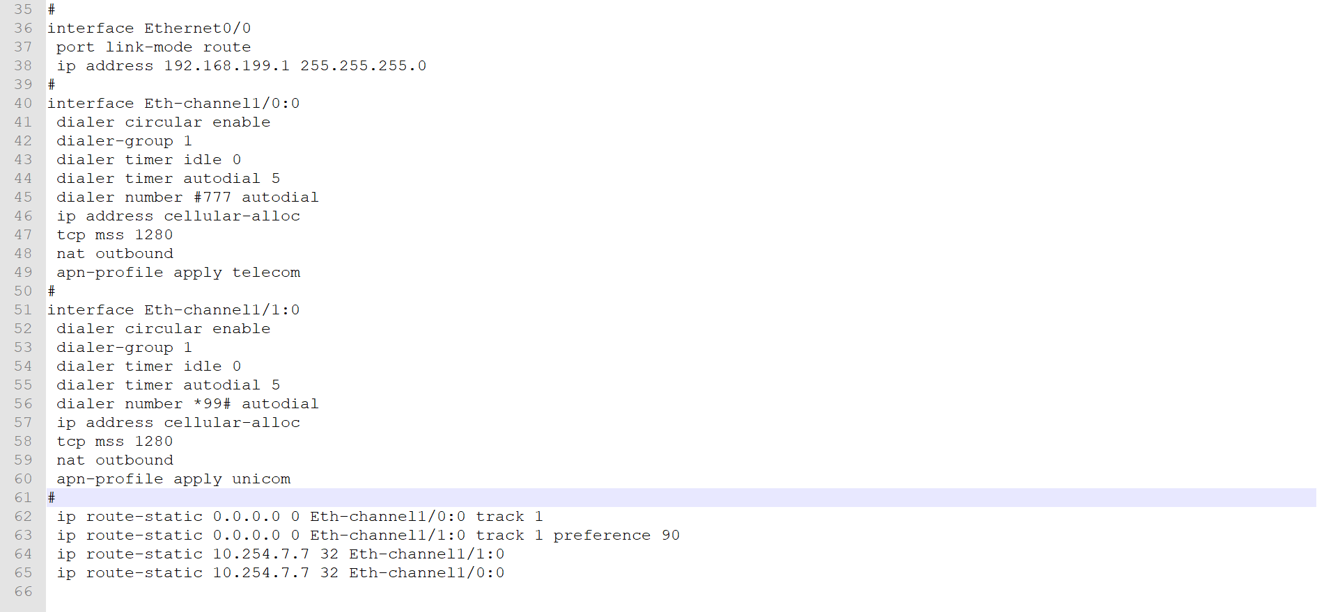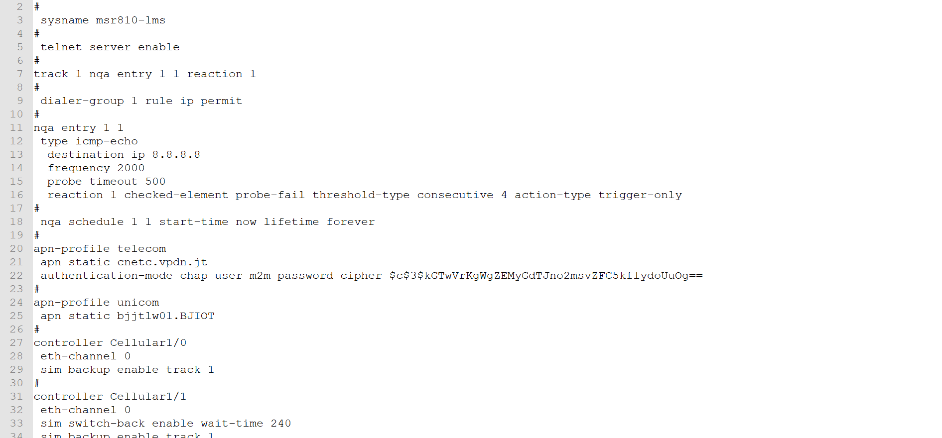 我现在实际使用的是nqa+track+静态路由——当使用电信卡时路由器通过nqa探测是否能到达测试地址8.8.8.8(客户隐私用这个地址代替),能ping通则一直保持电信,不能ping通则切换至联通。切换至联通时等待4小时后切回电信,如果nqa成功则继续保持电信,如果nqa失败则再次切回联通并等待4小时检测nqa。重复以上过程。