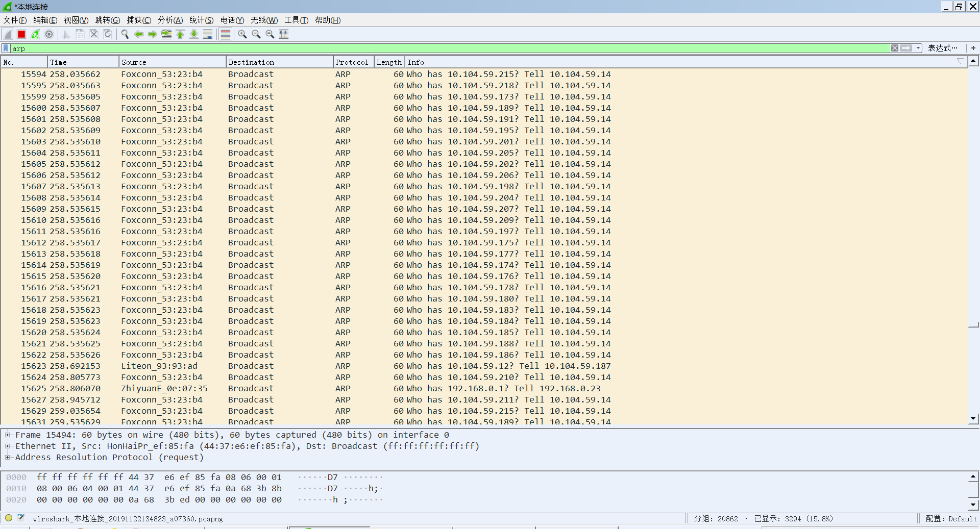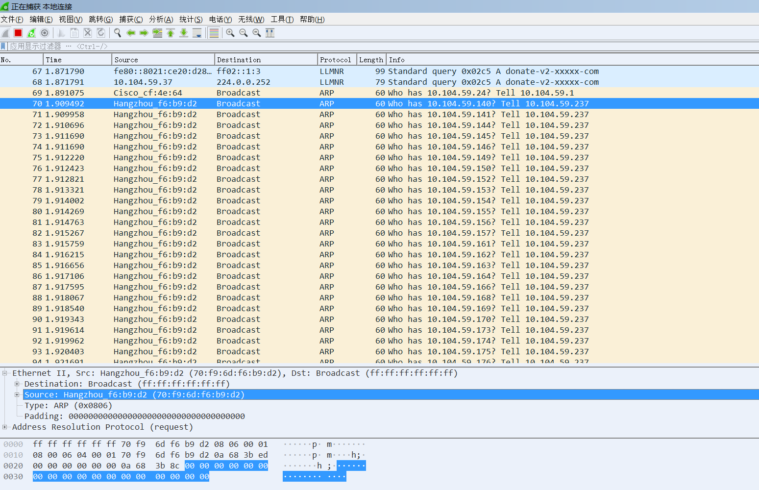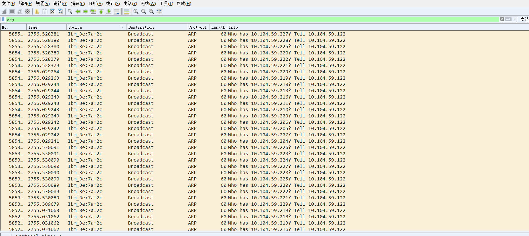 企业内部网络经常波动,QQ文件、照片等有时候会发送不出去,于是我就在网络卡顿的时候使用wireshark抓包分析,发现两台服务器和部分客户端不停地在全网广播,协议是ARP,请问这是中毒了的还是网络环路之类的造成的呢?如果是ARP攻击,找到发送源应该如何处理?(下图中10.104.59.237是防火墙,10.104.59.14是普通客户端,10.104.59.122是仓储用服务器)