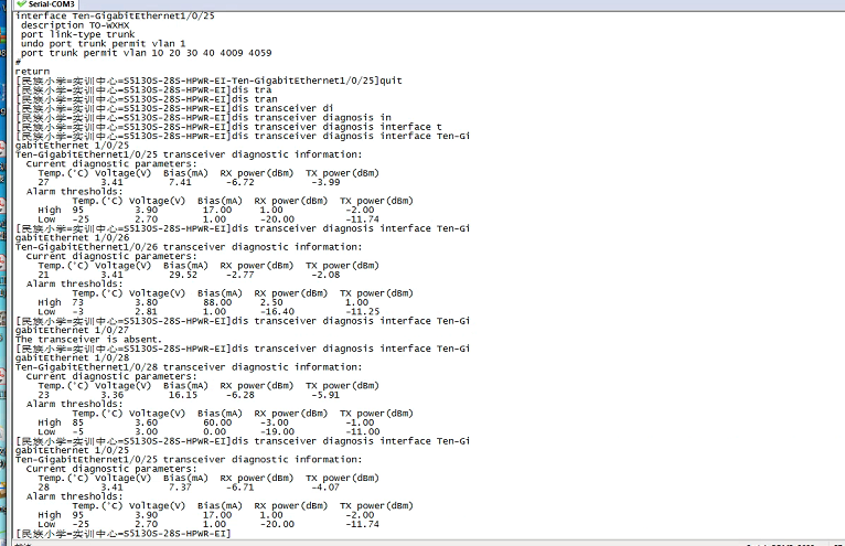 display  trans diag interface是看收发光功率,比如第一个RX=-6.72是收光功率,TX=-3.99是发光功率,收光功率正常范围是1.00----20.00,发光功率正常范围是-2.00---11.74