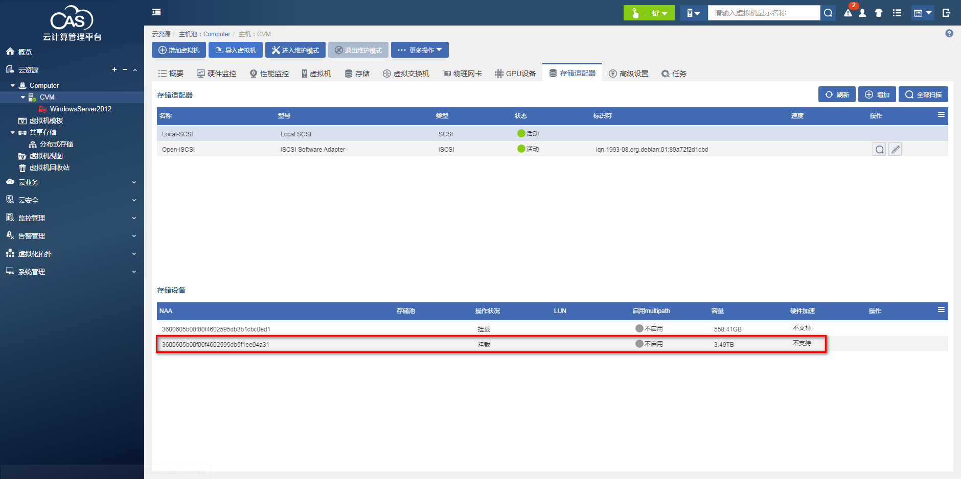这个sas是本地分区可以识别到 你看下这个cvk后台df -h有这个ssd分区吗 做的ssd应该需要在安装cas的时候不能使用自动分区 要在分区选择那里手动吧ssd的盘单独挂载出来才能识别到