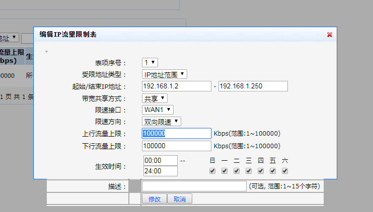 选择需要进行流量限制的计算机的带宽共享方式,当受限地址类型为IP地址范围时可选择独占或共享,为IP网段时,系统自动设定为共享,无法修改 · 独占:受限地址范围内的每台计算机各自占有给定的带宽(即流量上限),如IP地址范围为192.168.1.2~192.168.1.11,流量上限为3000Kbps,表示此IP范围内的每台计算机的流量上限为3000Kbps · 共享:受限地址范围内的所有计算机共享给定的带宽,如IP地址范围为192.168.1.2~192.168.1.11,流量上限为3000Kbps,表示此IP范围内的所有主机的流量之和的上限为3000Kbps |
