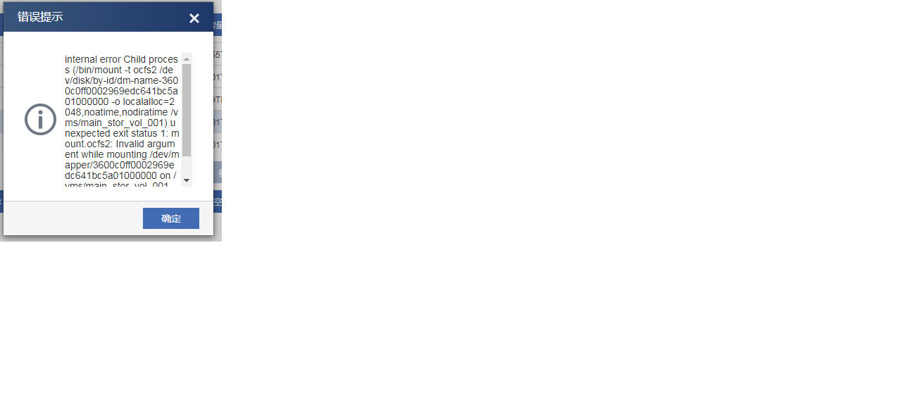 cas平台在主机启动存储池时有一个存储池启动不了,出现如下错误提示:internal error Child process (/bin/mount -t ocfs2 /dev/disk/by-id/dm-name-3600c0ff0002969edc641bc5a01000000 -o localalloc=2048,noatime,nodiratime /vms/main_stor_vol_001) unexpected exit status 1: mount.ocfs2: Invalid argument while mounting /dev/mapper/3600c0ff0002969edc641bc5a01000000 on /vms/main_stor_vol_001. Check 'dmesg' for more information on this error.
