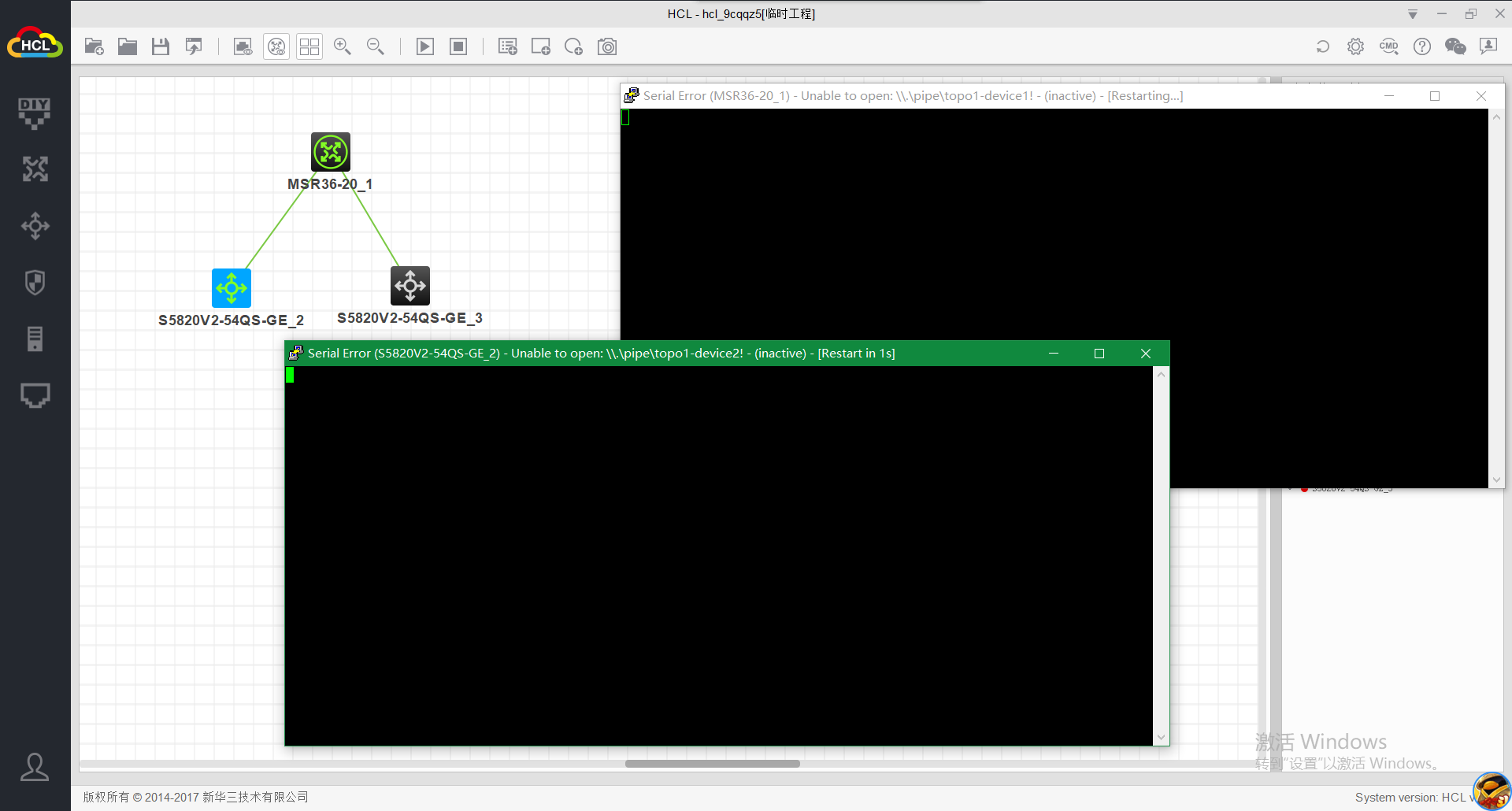 “启动命令行终端”后,窗口上显示“Serial Error (MSR36-20_1) - Unable to open:\\.\pipe\topo1-device1! - (inactive) - [Restart in 3s]”。