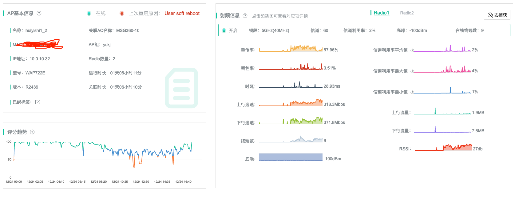 目前出现问题,在视频会议期间,AP表现出不稳定情况,视频会议语音延迟严重,查看AP发现,AP下重传率比较高