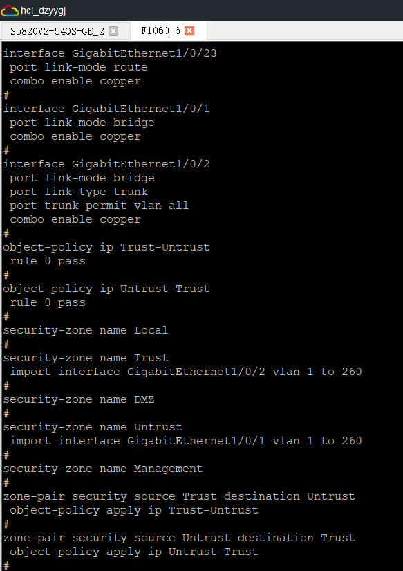 这是防火墙的 interface GigabitEthernet1/0/1 port link-mode bridge port link-type trunk port trunk permit vlan all combo enable copper # object-policy ip Local-Trust rule 0 pass # object-policy ip Trust-Local rule 0 pass # security-zone name Local # security-zone name Trust import interface GigabitEthernet1/0/1 vlan 1 to 300 # security-zone name DMZ # security-zone name Untrust # security-zone name Management # zone-pair security source Local destination Trust object-policy apply ip Local-Trust # zone-pair security source Trust destination Local object-policy apply ip Trust-Local #