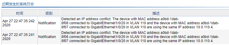 查看3层交换机日志每分钟记录Detected an IP address conflict. 提示如图