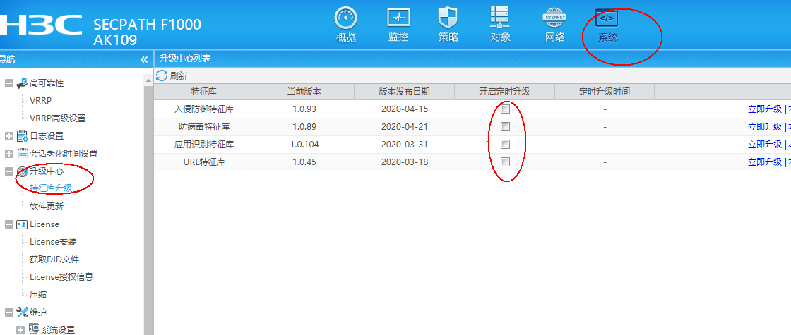把防火墙的管理配置配置上网 ,防火墙上面配置好dns服务器。在系统-升级中心-特征库升级里面开始定时升级就好。
