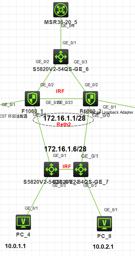 如上图,防火墙做了IRF+双机热备,发现问题核心跟防火墙直连都不通。(一开始只配置IRF没有配置双机热备是可以通的),Reth2已经加入了Trust,安全策略放通了Trust到local。难道是模拟器问题吗?