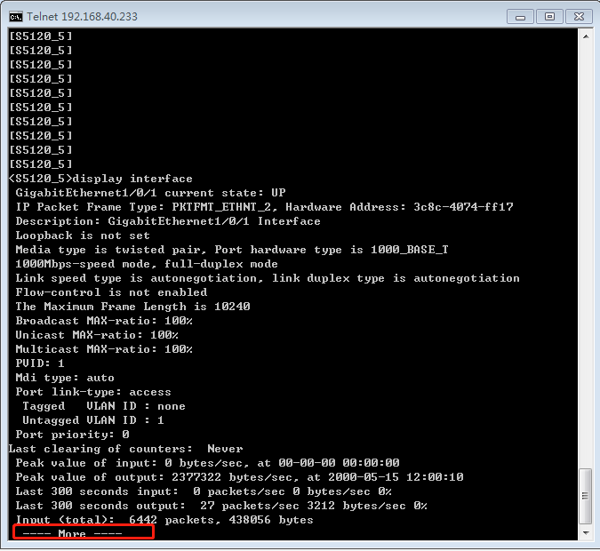使用telnet + 串口服务器的IP + 交换机连接的端口号连接至交换机控制台 输入display interface 显示出交换机的端口详情 但是只显示一部分 后面的需要一直按回车键才显示 现在的问题是怎么才能让所有信息一次显示完整