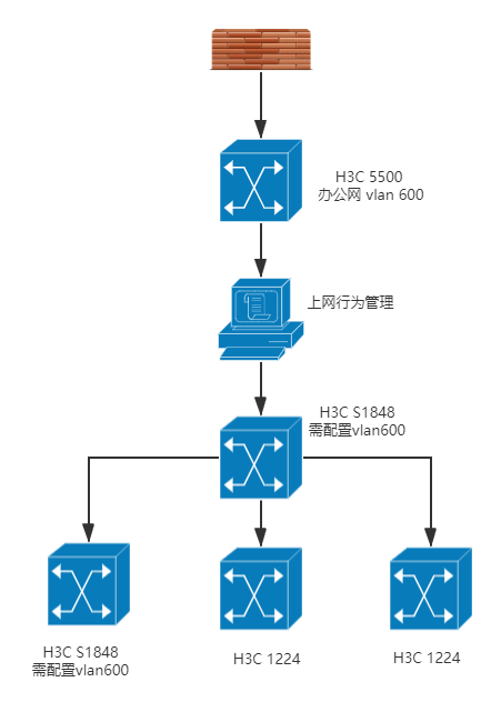 之前所有接入和汇聚都是傻瓜交换机,公司改造将24口的接入汇聚都换成了48的H3C 1848 。将1848接入口都配置成vlan600、上联口配置成trunk 后,接入无法通过上网行为管理设备。