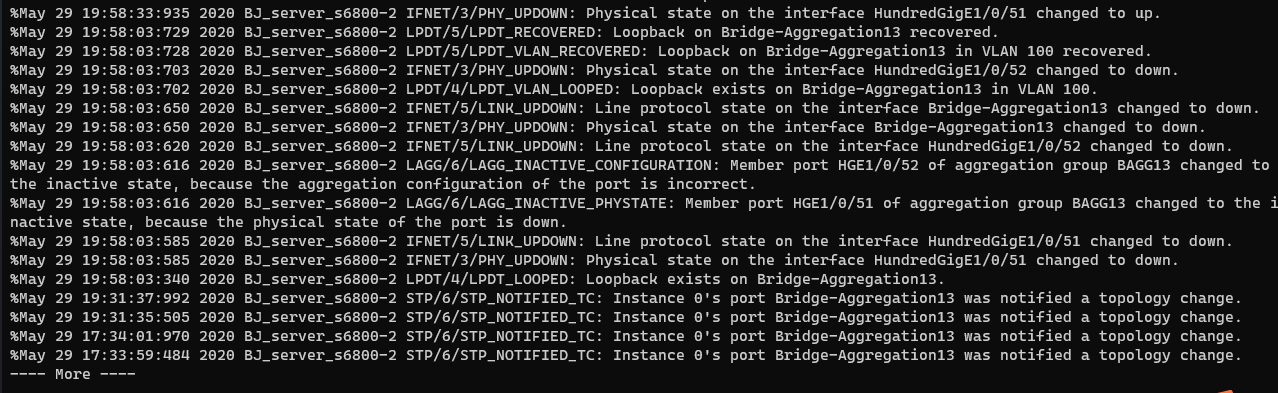 此交换机100G端口聚合上联到核心,出现了闪断的情况,看log是先有端口down,聚合成员端口发生变化,然后又提示vlan100有环路,但自己又up了,这一切都是瞬间,很奇怪,vlan100明明没有环路,求指导。