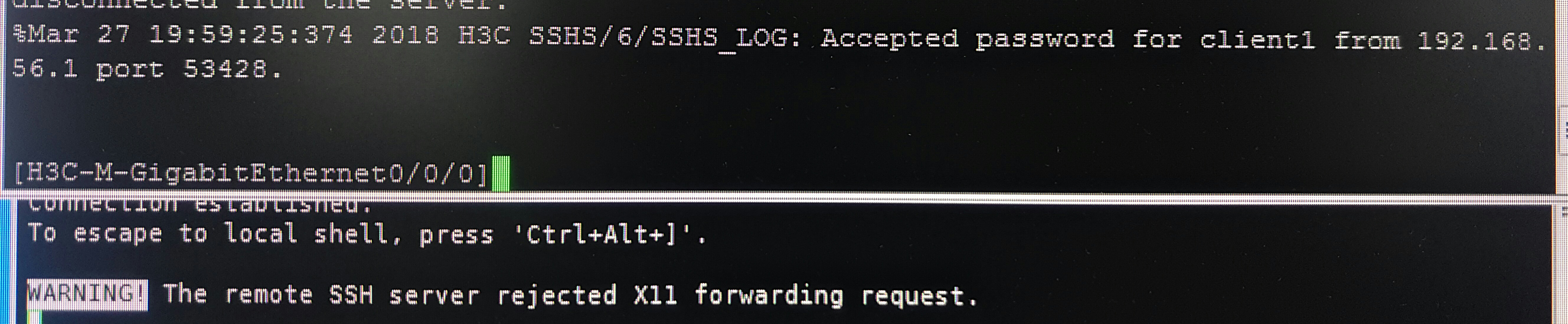 设备上已经显示连接成功,但是xshell就卡在那个warning后面,图上面是设备显示,下面是xshell显示