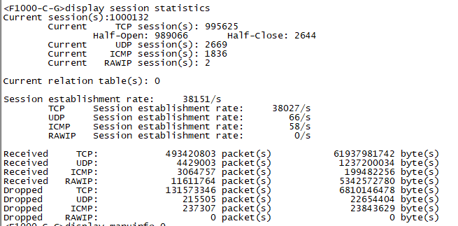tcp syn flood攻击,总共会话有99w,其中半开98w,被攻击了。