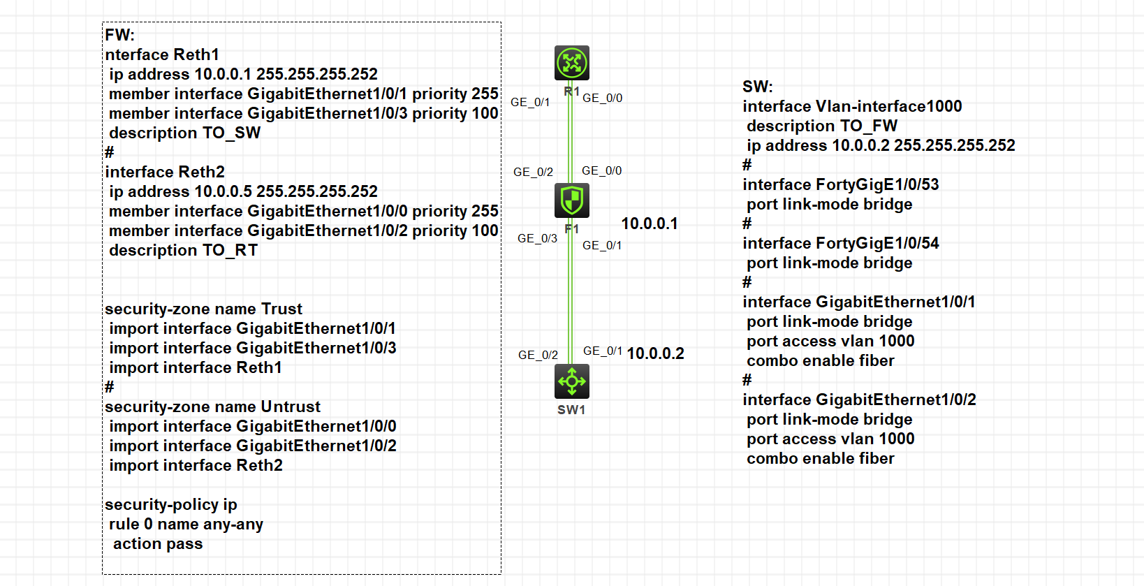 现在的配置时这样的,有两个问题1.现在这样配置有什么问题吗,互联不通2.还有就是交换机流量到防火墙走那根线