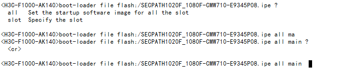 <Sysname> boot-loader file slot1#flash:/all.ipe all main