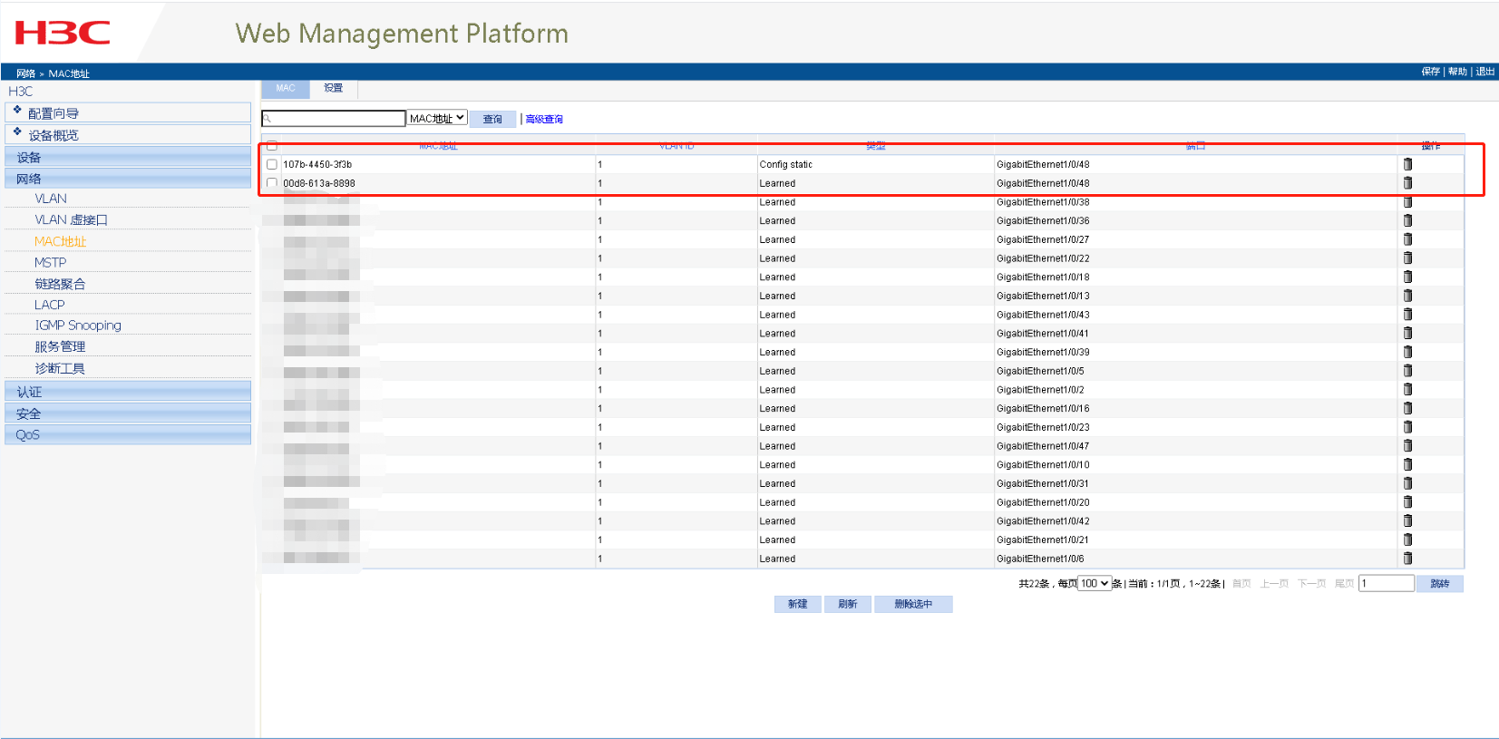 设备是S1848G,要做端口静态绑定MAC地址。 现在是配置都配置好了,但是不生效,指定端口MAC最大数量为0了,并且配置了静态MAC,还是会学习其他的MAC。导致MAC静态绑定失效。我导出配置查看,该端口是写入了配置的了。interface GigabitEthernet1/0/48 mac-address max-mac-count 0 mac-address static 107b-4450-3f3b vlan 1测试黑洞MAC,是可以拦截住指定MAC地址的。 软件是最新版本1106。