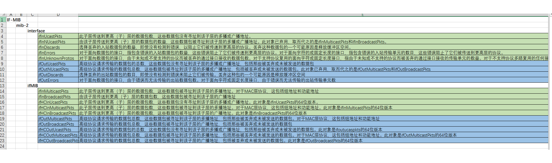 因项目需求需要通过snmp协议获取交换机的端口流入/流出利用率、端口入/出丢包率。目前已经得知端口的带宽是通过ifHCInOctets来计算,但是不知道利用率及丢包率怎么计算。跪求大神指点。(下图是我我统计的IF-MIB中关于端口数据包相关的oid信息)
