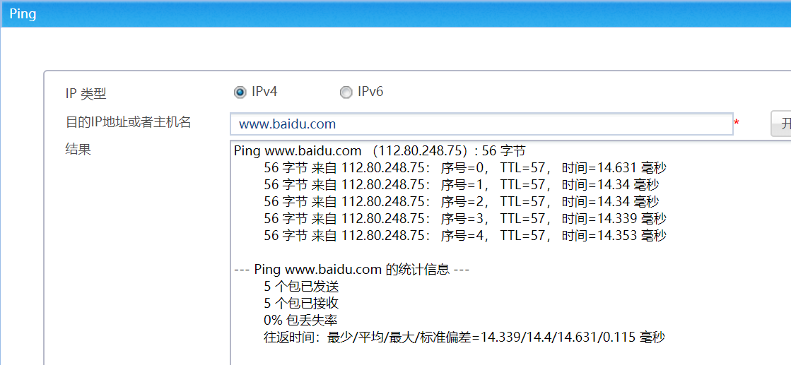 3、需要在设备上正确配置DNS服务器,因为www.h3c.com.cn在公网已经禁ping,所以测试可以正常解析到www.h3c.com.cn域名的IP地址即可;