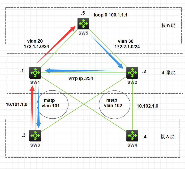 从接入交换机SW3 ping核心交换机SW5时,会发生来回路径不一致的问题,红色为去的路径,蓝色为回来的路径。