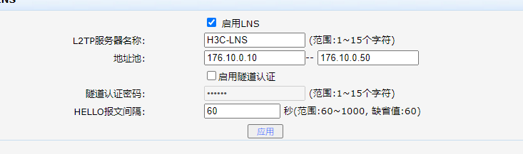配置LNS信息(启用LNS,输入L2TP服务器名称:H3C-LNS,地址池:10.10.11.10~10.10.11.20,单击<应用>按钮生效) | |