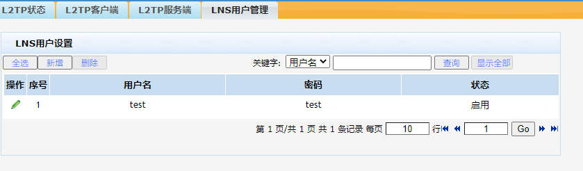 单击【VPN】--【L2TP VPN】--【LNS用户管理】,点击【新增】。