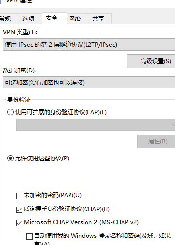 点击【安全】选择VPN类型为【使用IPsec的第2层隧道协议(L2TP/IPSEC)】,数据加密选择【可选加密】,允许协议选择【质询握手身份验证协议(CHAP)】。