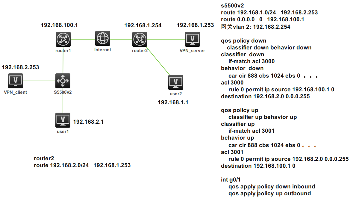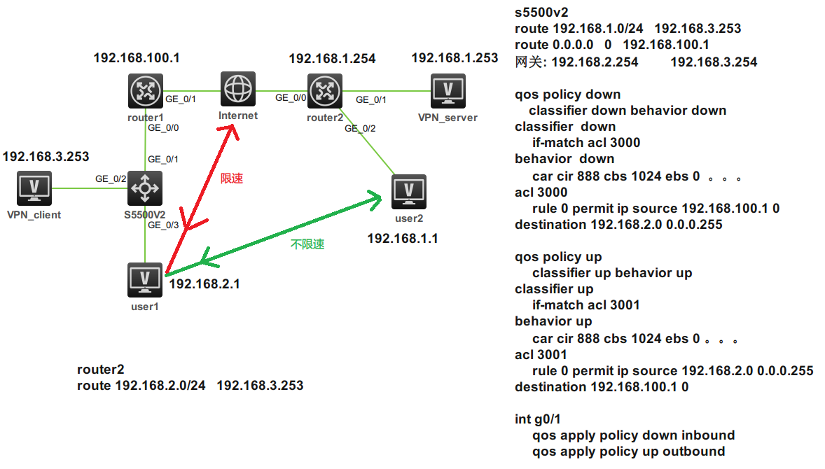 现在想限制user1访问外网的速度,user1和user2的访问不做限制,5500的配置在图里面。
