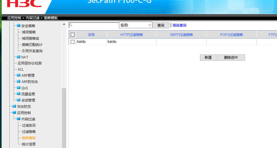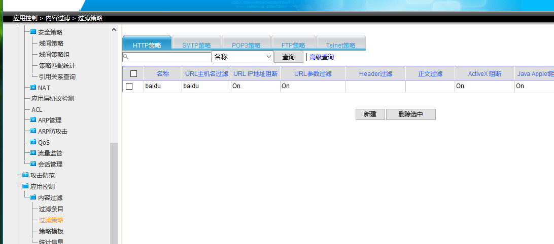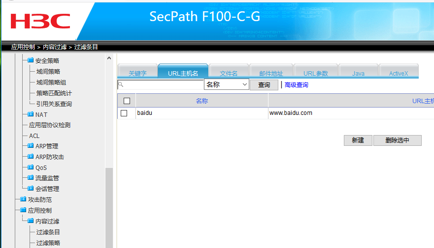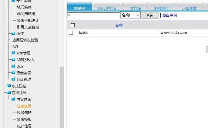 现有一台V5防火墙F100-C-G,做了对百度的URL过滤之后失败,配置如下图所示