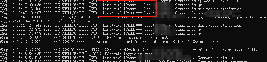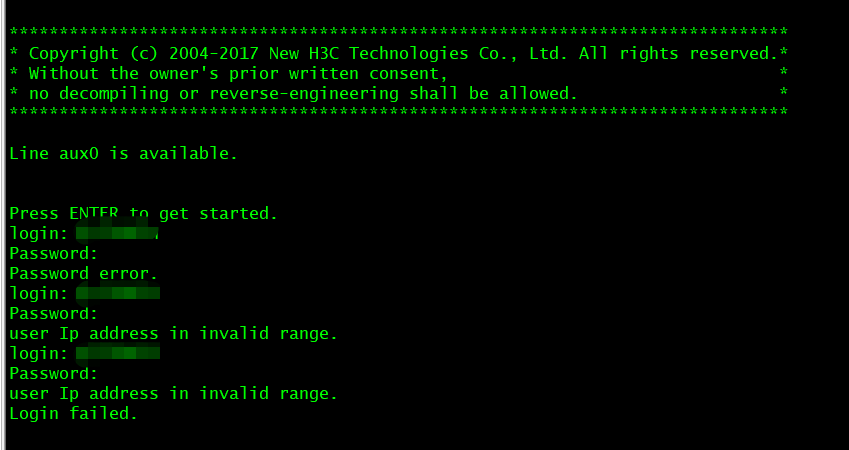下面是console口登录扬子报错的截图以及设备的登录日志,日志里面显示,使用console口登录时的IP地址为空