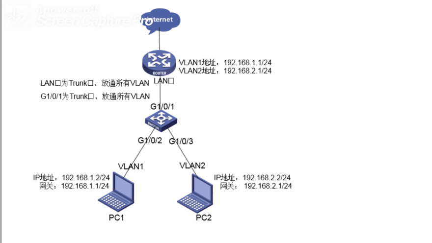 MSR路由器作为下面两个网段,192.168.1.0/24网段和192.168.2.0/24网段的网关。将路由器的G0/0口与交换机G1/0/1口相连,在路由器G0/0上创建虚地址;交换机与路由器的互连接口都配置成trunk口,并放通vlan2通过。交换机的G1/0/2接PC1,G1/0/3接PC2,要求PC1和PC2可以访问互联网(访问路由器的网关)。