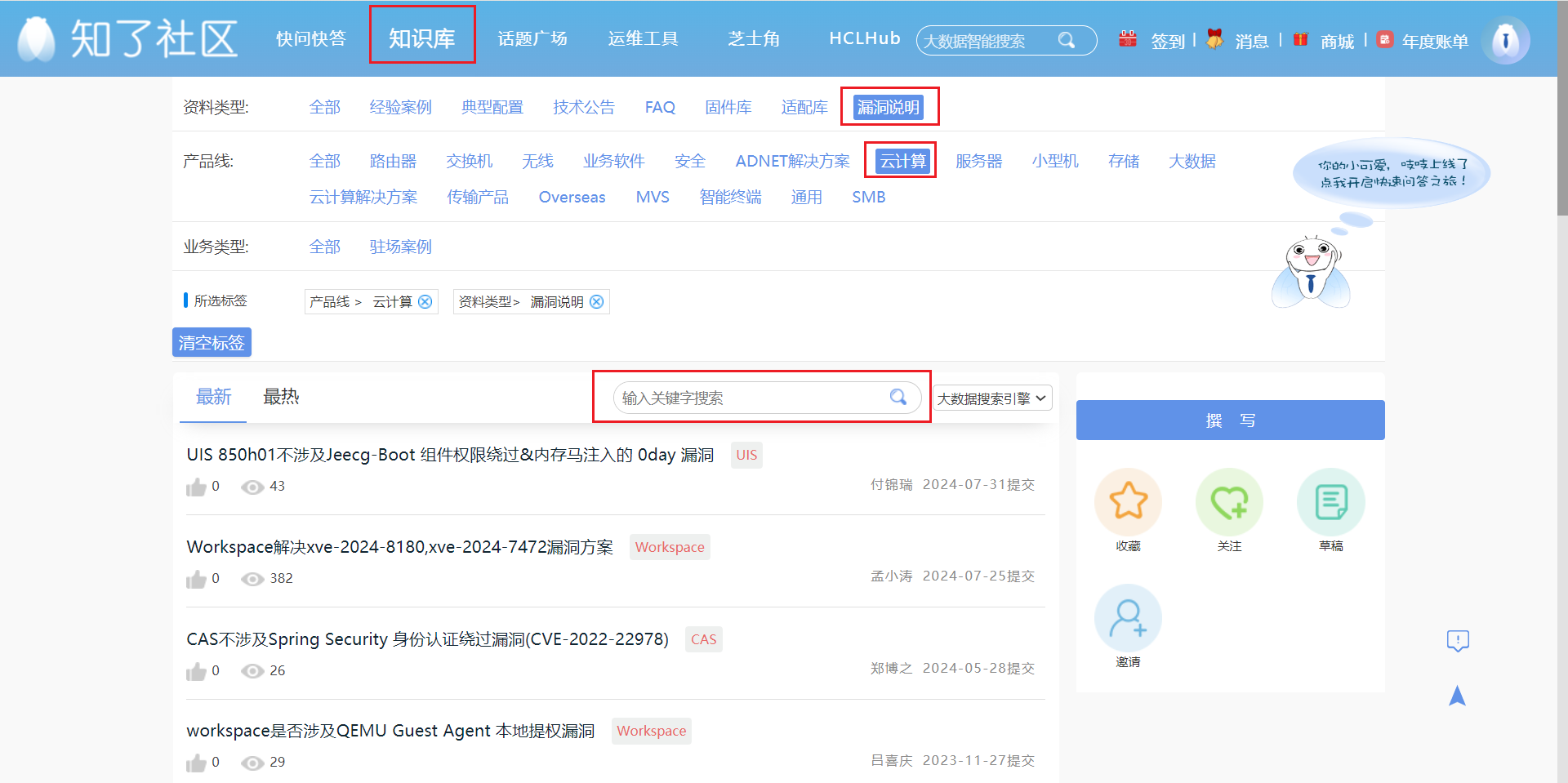 在官网首页 支持 文档与软件 软件下载 云计算对应产品推荐版本或最新版本下,会上传对应版本的漏洞列表,内包含大部分漏洞的说明。