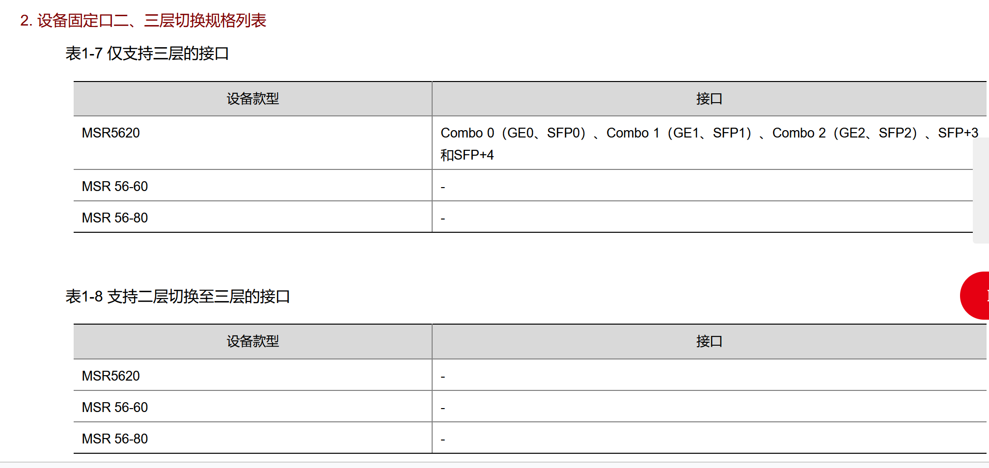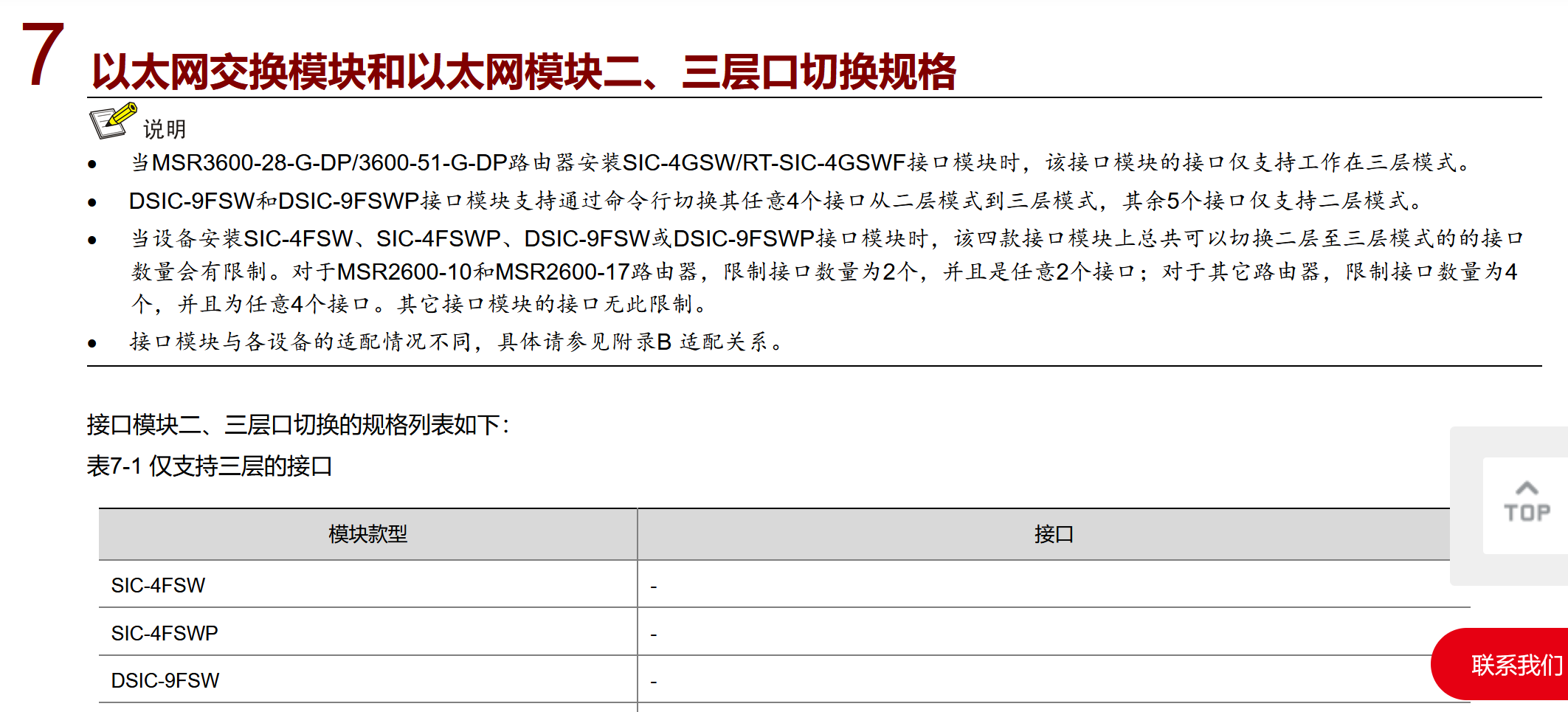 6、MSR5620固定口、 接口模块 ( 以太网交换模块和以太网模块 )是否支持二、三层口之间切换? --- 固定口 :点击 相关产品“硬件描述”-“ 01-产品介绍 ”-“ 1.2.3 MSR 5600路由器二、三层口切换规格”章节 ;接口模块: 点击 相关产品“接口模块手册”-“ 01-正文 ”-“7 以太网交换模块和以太网模块二、三层口切换规格”章节