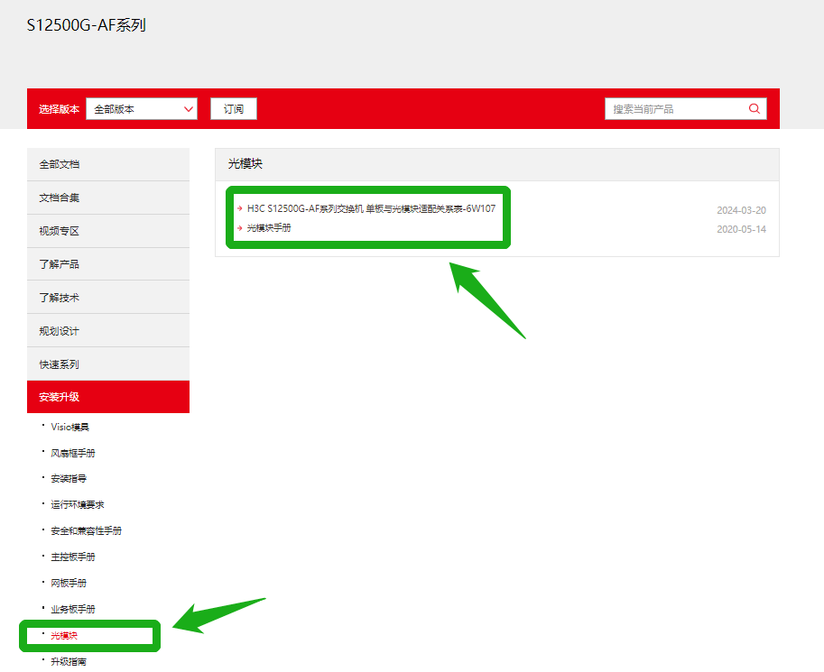 官网位置:(注意部分产品没有产品与光模块适配关系表、可以查找对应安装指导或硬件描述手册)
