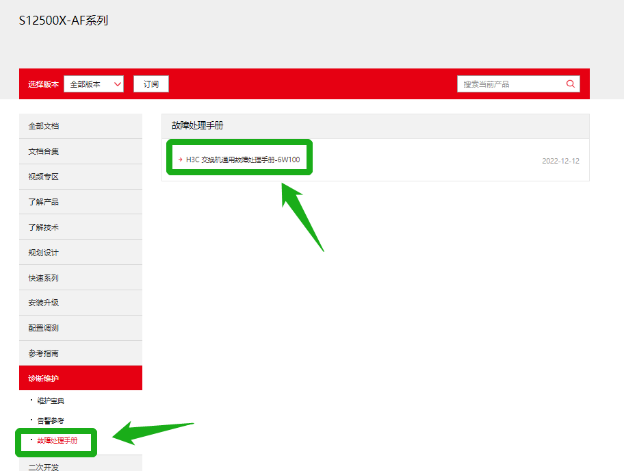 S12500X-AF系列、S9800系列、S6800系列 等产品故障处理手册见附件,此类文档列出交换机软、硬件常见故障的诊断及处理措施 。