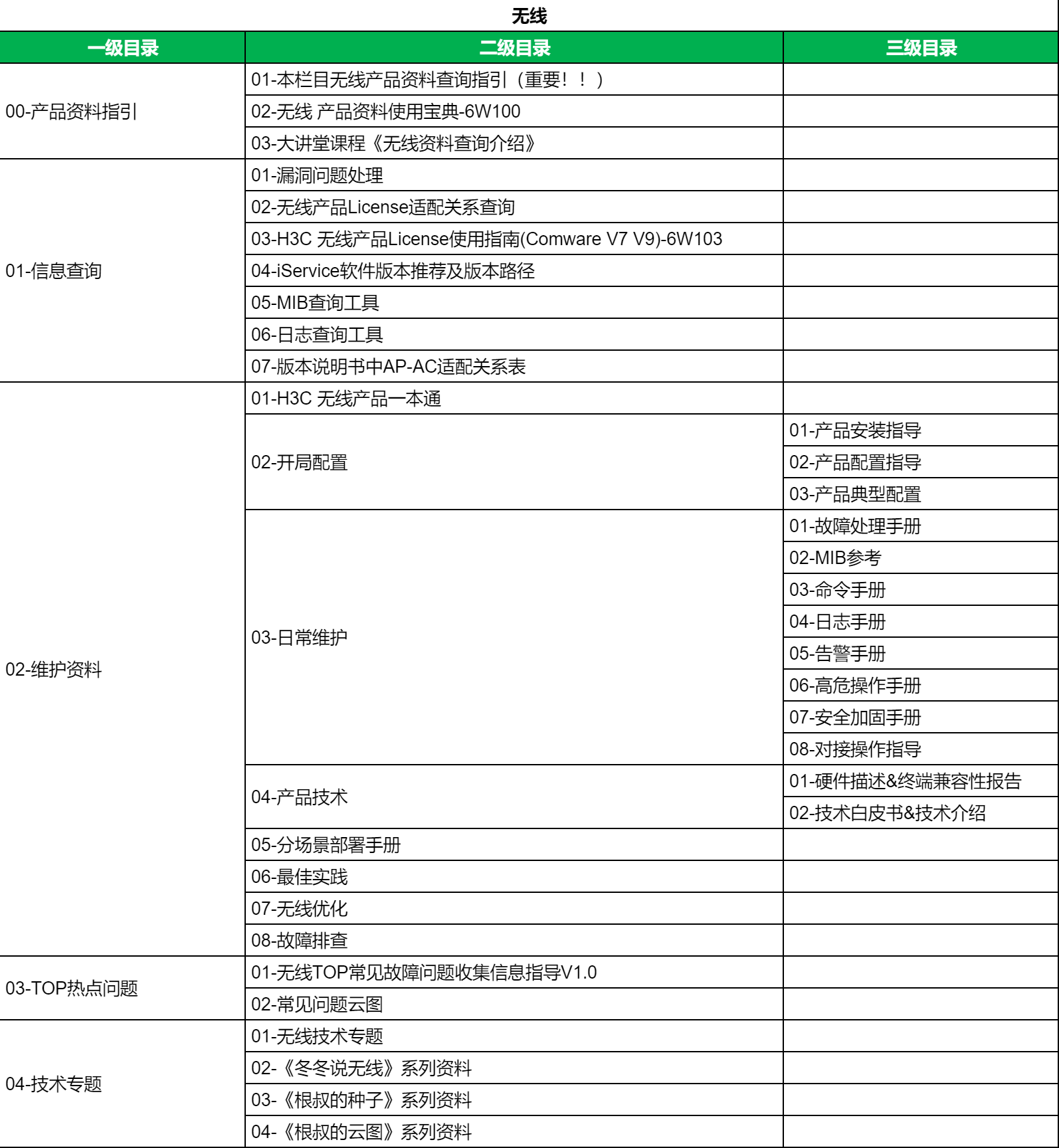 知了社区资料中心无线栏目全新上架,栏目从以下模块对H3C无线产品资料进行了系统性分类, 共享服务平台资源体系,助力合作伙伴技能提升。