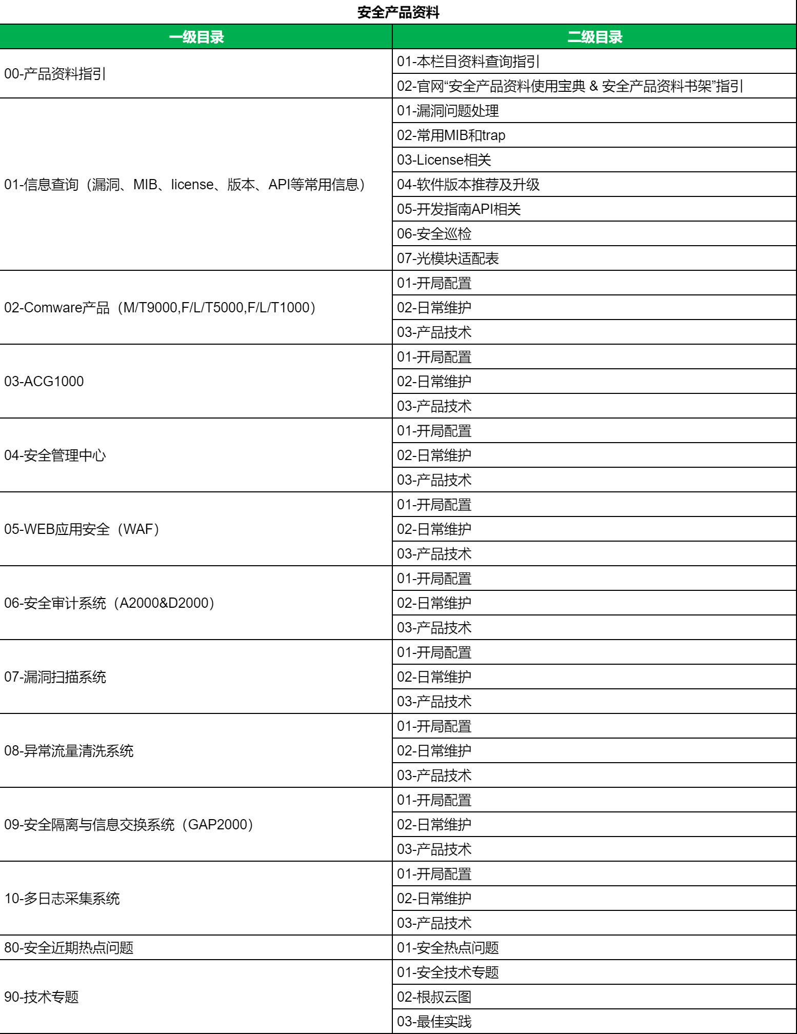 02-Comware产品(M/T9000,F/L/T5000,F/L/T1000)、04-安全管理中心、03-ACG1000、05-WEB应用安全(WAF)、06-安全审计系统(A2000&D2000)、07-漏洞扫描系统、08-异常流量清洗系统、09-安全隔离与信息交换系统(GAP2000)、10-多日志采集系统:
