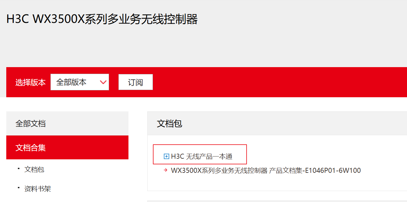 H3C 无线产品一本通是包含产品介绍、安装指导、典型配置、场景化部署、License管理、网络优化、故常处理和FAQ、部署与维护指导、以及常用工具介绍等内容的无线产品与技术文档合集,是工程师无线开局与运维的好帮手。无线一本通可以从官网的“支持>文档中心>无线>XX型号无线产品>文档合集>文档包”路径下获取,具体如下: