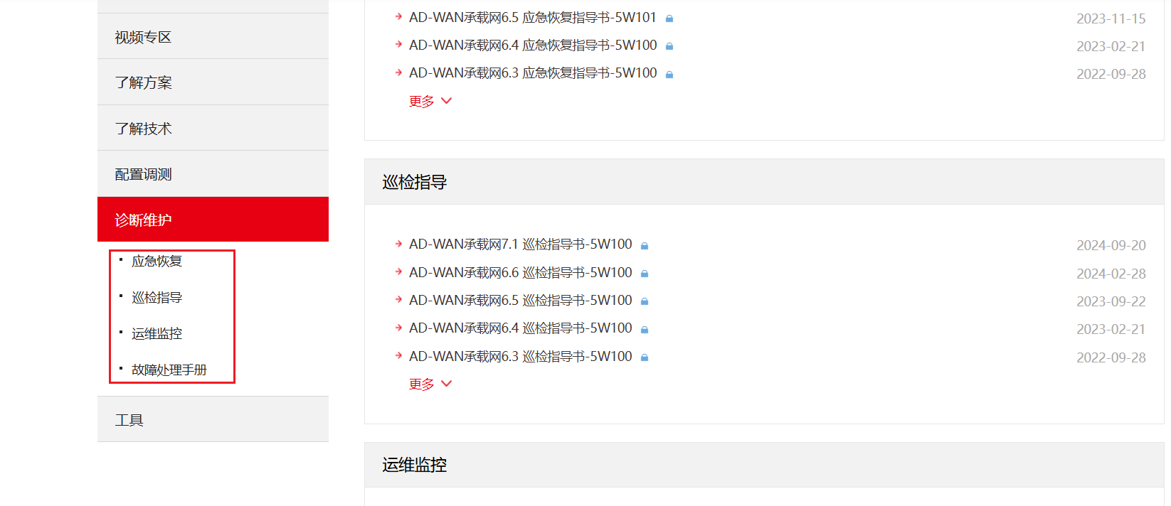 ADWAN承载网的应急恢复手册、运维监控手册、巡检指导手册以及故障处理手册可参考官网文档中心-智能管理与运维-应用驱动园区网络-AD-WAN承载网方案中的诊断维护栏目
