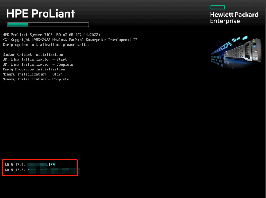 4. 服务器配置完成后,开启服务器时可以查看到已经配置的iLO地址。