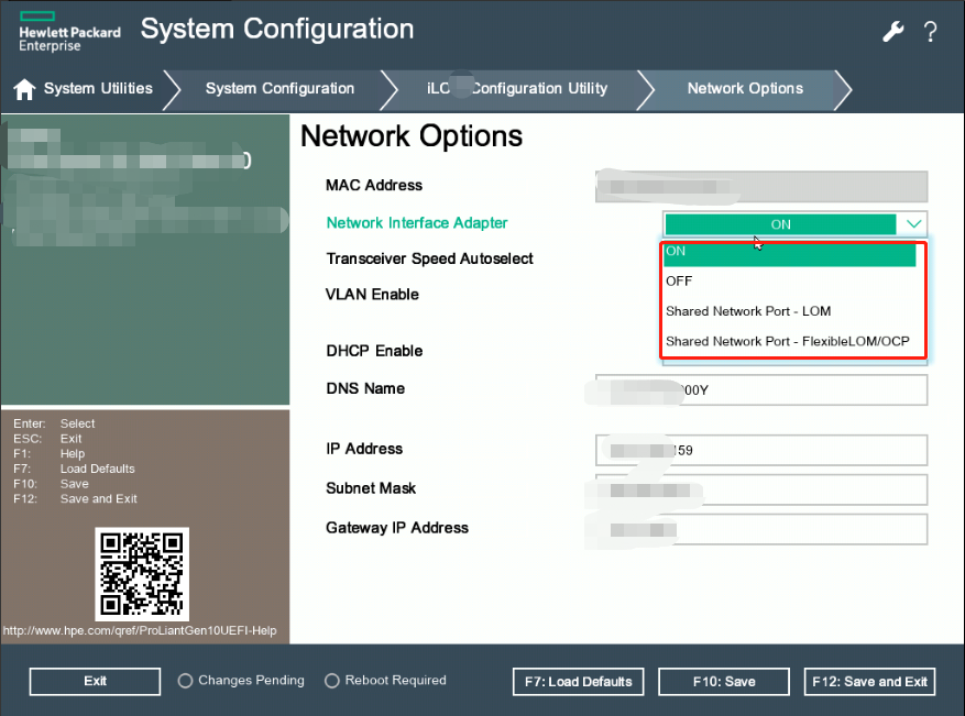 在”Network Interface Adapter”中选择需要设置共享口的网卡,然后关闭DHCP服务和VLAN服务,输入iLO地址、子网掩码和网关,配置完成后按F10保存。(注:网卡1号网口默认设置为共享口,如有VLAN需求,也可以在此配置中开启VLAN,并填写VLAN相关配置;)