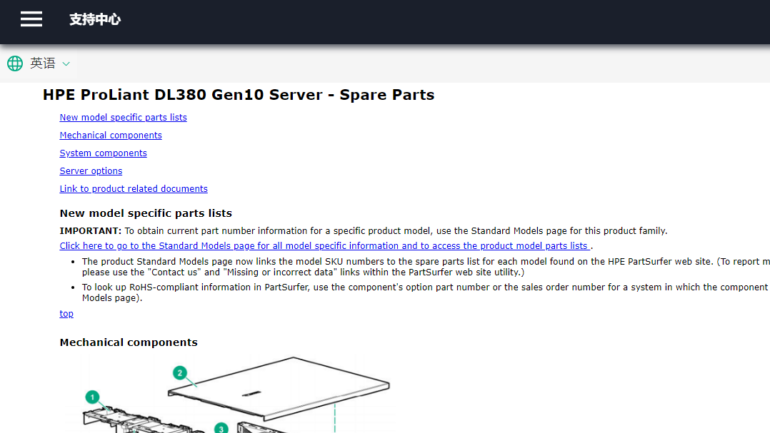 4. “部件”指南:可查看此型号服务器相关的硬件配置介绍以及相关选件型号信息等。
